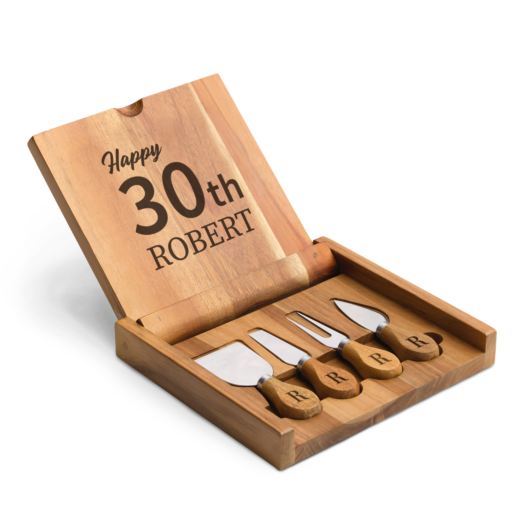 Acacia hardwood cheese board with FDA grade food oil finish. Stainless steel/acacia hardwood cheese knives and fork.