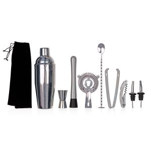750ml Shaker, Muddler, Separator Spoon, Strainer, 15/30ml Double Jigger, 2x Free Flowing Nip Pourers, Corkscrew, and Ice Tongs.