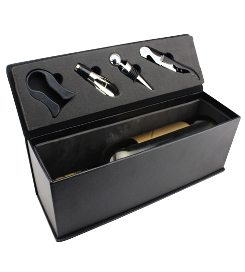 Set includes a bottle and cork opener, cork remover, pourer, and a bottle stopper. Does not include a wine bottle.