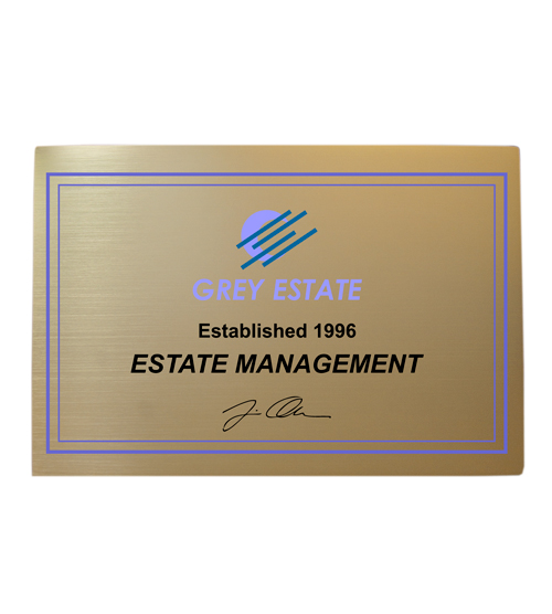 Gold anodized aluminium plaque for Interior & Exterior *. UV Printing can be done on Gold anodized aluminium. Full colour text, lines and shapes will be used on this plaque.