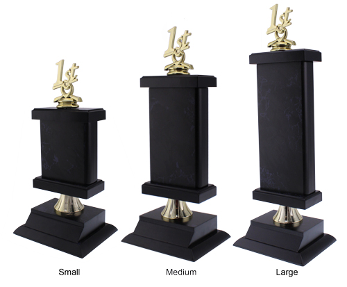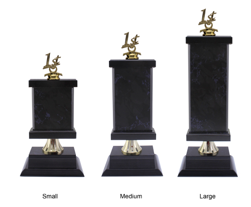 The Levadia Marble #4 Trophy is a customisable trophy that will stand out in your team or club awards. This award features a black marble wooden finish column with elegant and decorative black trim. As well as a gold accent spacer between the column and the base. Your choice of any standard figurine mounted on the top of the wooden tower. The Levadia Marble #4 Trophy comes in three sizes, perfect for any award presentation. We have a range of sports trophies all available online. Great for any team or individual awards.