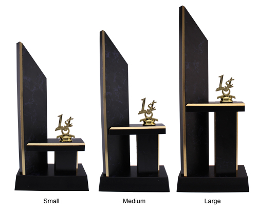 The Levadia Marble #5 Trophy is a customisable trophy that will stand out in your team or club awards. This award features asymmetrical columns, with a platform for your chosen figurine. It has a black marble wooden finish with elegant and decorative gold trim, framing the tower. Your choice of any standard figurine mounted on a wooden base. The Levadia Marble #5 Trophy comes in three sizes, perfect for any award presentation. We have a range of sports trophies all available online. Great for any team or individual awards.