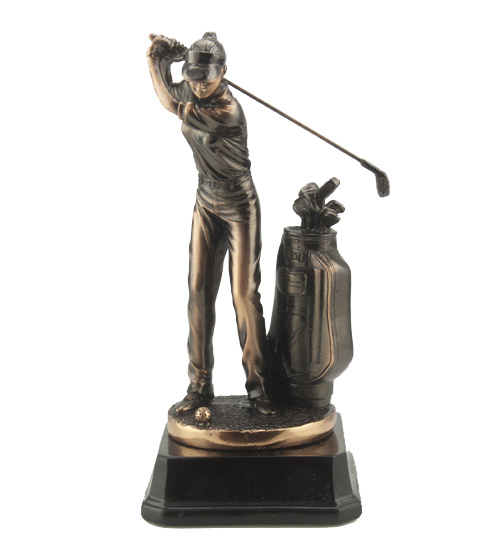 The Female Golf Trophy features a detailed female figure holding a golf club, with a detailed golfing bag and golf ball. Mounted on a resin podium. An economical resin trophy, hand-painted in traditional antique gold. Customise your engraving to give your award that personalised touch at no additional cost. We have a range of medals and awards to complete your collection. Great for individual or team awards.